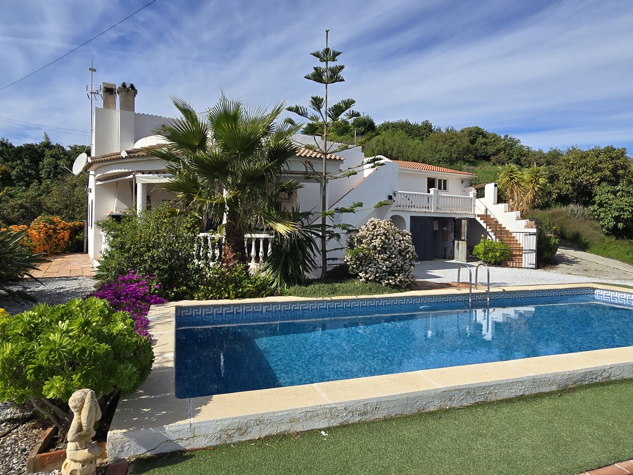 EXCLUSIVE: Villa Jurgen, a stunning country property located just 1.5 km from the heart of Benamargosa village. Set behind a gated entrance with parking for two to three cars, this private retreat offers a combination of comfort, style and breathtaking views.The main villa is a detached 3-bedroom, 2-bathroom home with spacious living and dining areas. High ceilings with decorative coving, archways and a pellet burner in the lounge create a warm and inviting atmosphere. The galley-style kitchen is fully equipped with modern appliances including an American fridge/freezer, oven, gas hob, dishwasher, washing machine and granite worktops.The master bedroom offers air conditioning, a fitted wardrobe and an en-suite bathroom, with potential for direct access to the covered terrace. Two additional bedrooms share a guest bathroom and all rooms are well-sized with pleasant garden views. A spectacular roof terrace provides panoramic views of the surrounding mountains and property.In addition to the main villa, the property features a separate guest apartment, ideal for Airbnb or extended family. This self-contained space includes one or two bedrooms, a modern bathroom, its own terrace and independent utilities.The villa sits on over 3,000 m² of land, featuring an oversized 10-meter pool with corner steps and a ladder, multiple terraces and a variety of trees including a small orchard area. From here, you can enjoy distant sea views, mountain scenery and gentle breezes, all in complete privacy.Practical features include two large water tanks (12,000 L and 5,000 L) supplied from the Pantano lake, mains electricity, septic tank waste and a tourist license already in place. The property also offers a garage with workshop space, built-in barbecue and multiple covered terraces.With its combination of privacy, space and potential, Villa Jurgen is an exceptional opportunity for those seeking a luxurious country home or high-potential rental property.